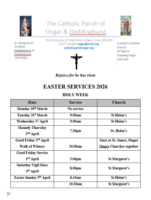 The Sacrament of Individual Reconciliation is available on Saturdays 4.30pm – 5.15pm before Holy Mass at 5.30pm at St. Helen’s, Ongar or on request at St Margaret’s, Doddinghurst